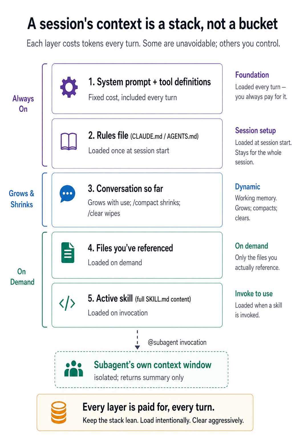 - Subagents. Isolated context windows for noisy reads (codebase exploration, doc fetching).